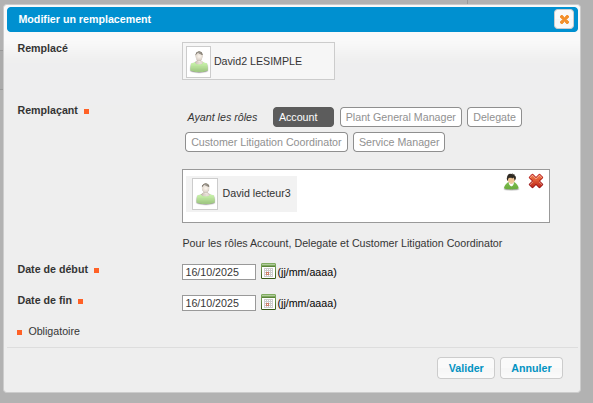 Il est possible de désigner un remplaçant différent pour chaque rôle distinctement en choisissant pour chacun des rôles l'utilisateur qui ne joue que ce rôle en particulier et pas les autres.