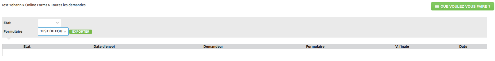 Dans FormsOnline, comment accède t'on à la fonction d'export de demandes ? (Je ne le trouve nulle part.)